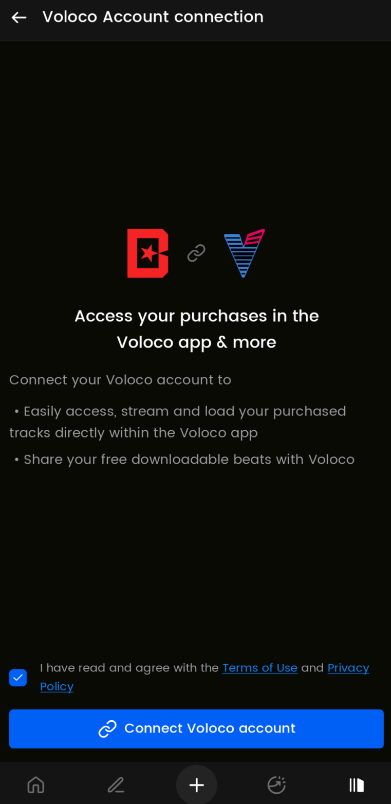 - Bestätigen Sie, dass Sie die BeatStars Nutzungsbedingungen und die Datenschutzrichtlinie gelesen haben, und klicken Sie dann auf die Schaltfläche „Voloco-Konto verbinden“.