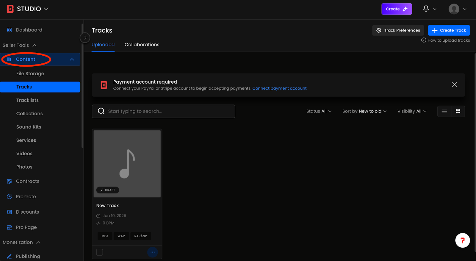 - Klicken Sie im Studio unter dem Dropdown-Menü "Content" auf der linken Seite auf den Abschnitt "Tracks".