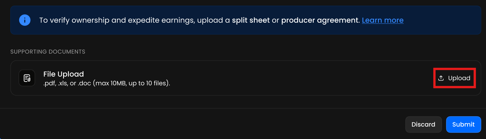 - Sie können nun Ihre unterschriebene Produzentenvereinbarung oder Aufteilungsvereinbarung zusammen mit Ihrer Publishing-Einreichung hochladen, um Ihre Registrierung zu beschleunigen.