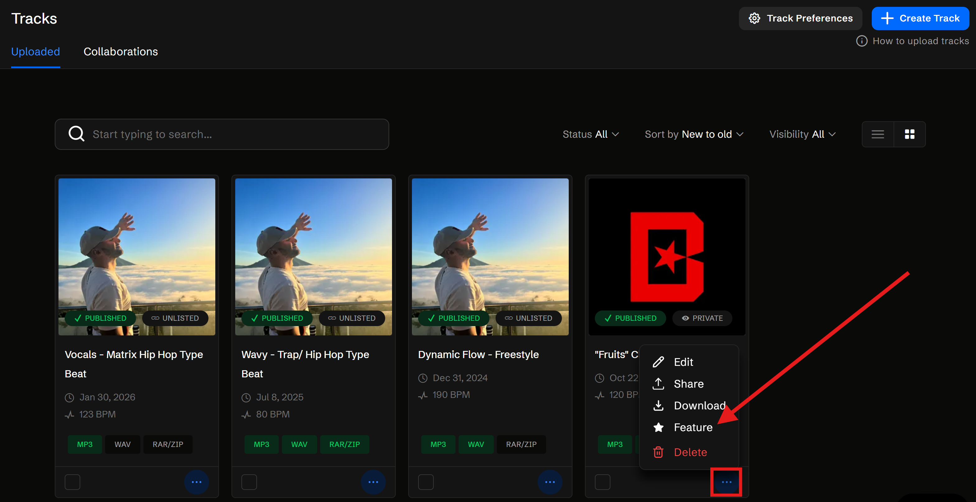 - Klicken Sie unterhalb bzw. neben dem gewünschten Beat auf die 3 Punkte und wählen Sie die Option „Feature“, um den Track hervorzuheben.