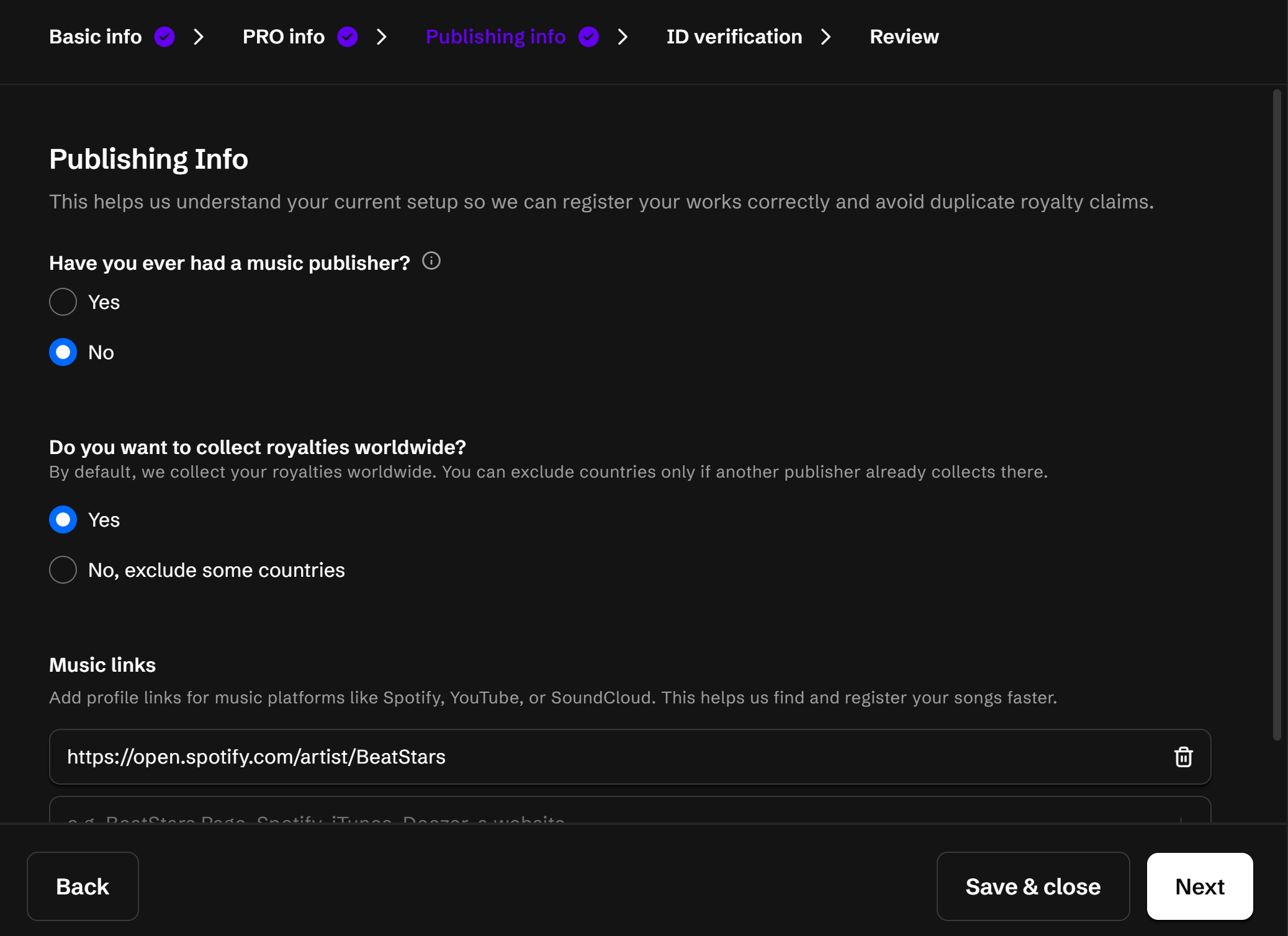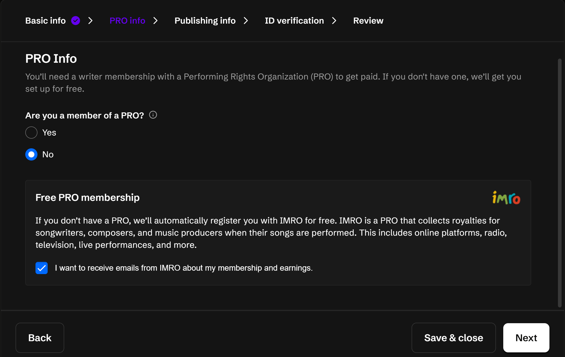 If you do not have a PRO, you can apply for one for free by clicking "No" for "Are you a member of a PRO" then the checkbox for IMRO. Then click "Next".