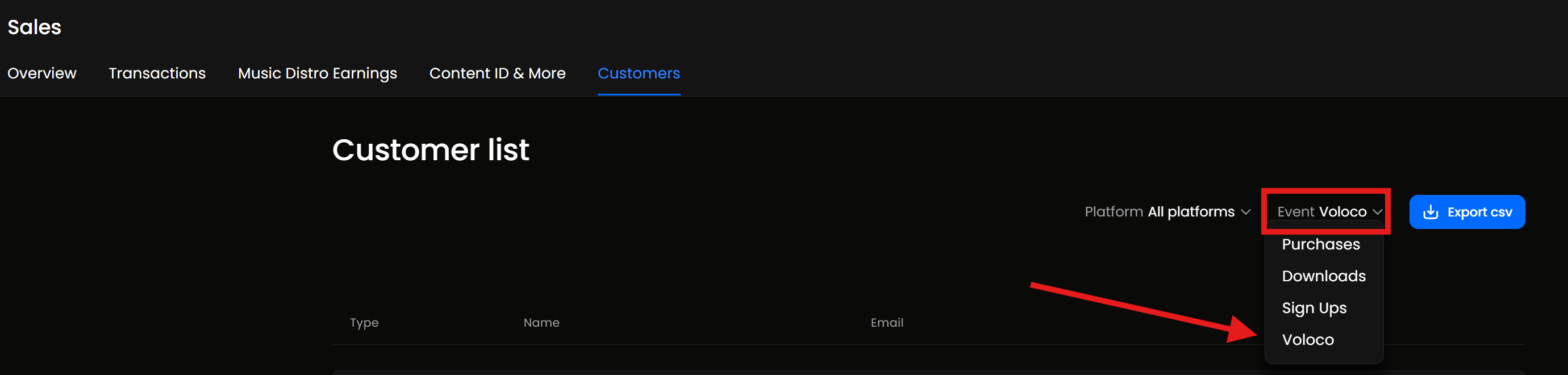 Then, select the "Customers" tab and change "Events" to "Voloco".