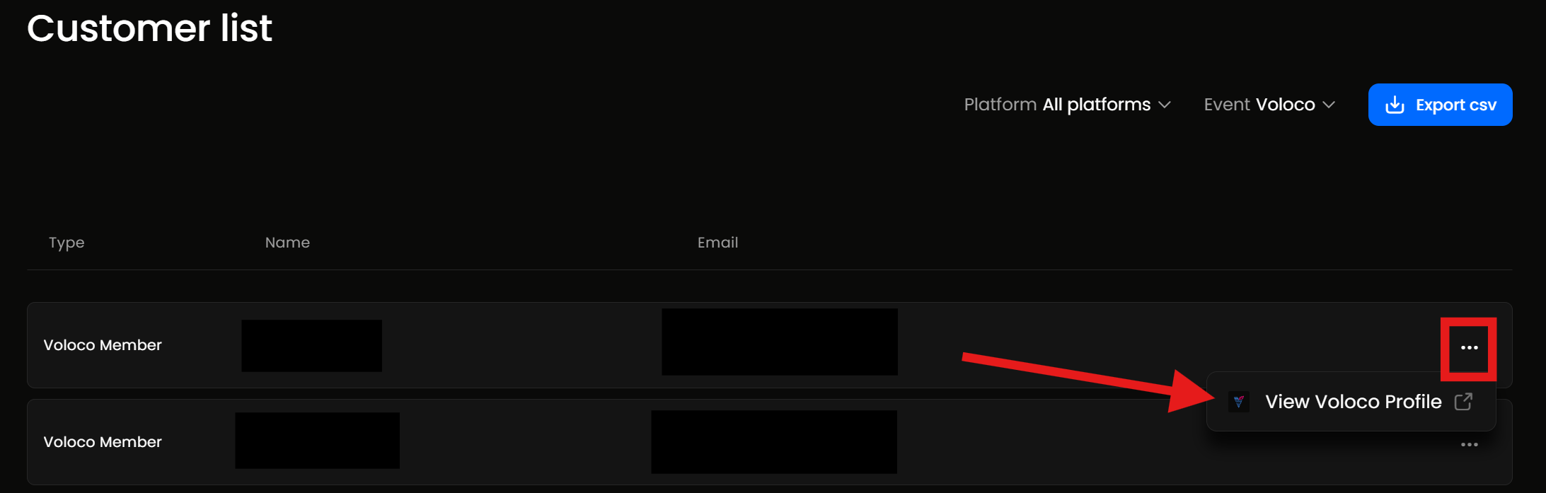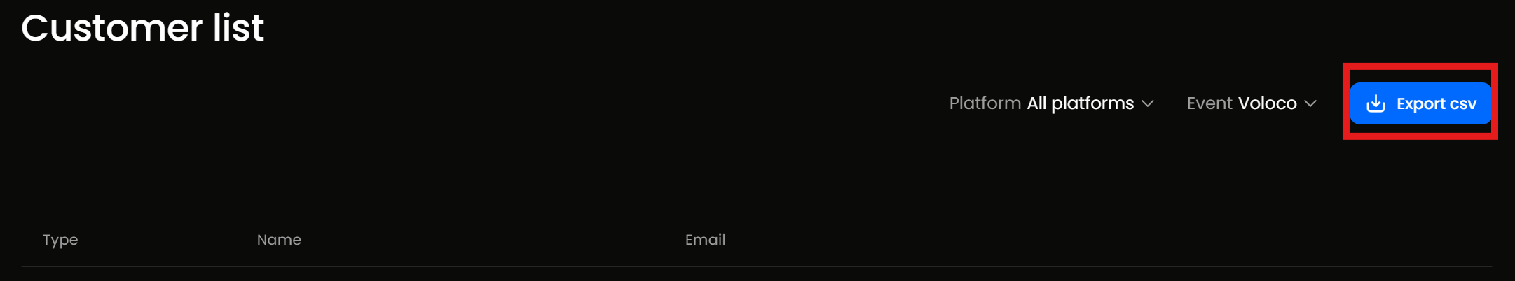 - You can also export your Voloco Customer list by selecting "Export CSV", which will provide the list in a CSV format.