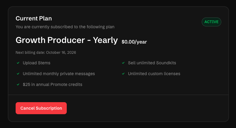 - Visit the "Subscription" section of your Account Settings: https://beatstars.com/account/subscription