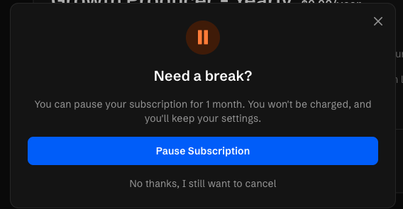 6. You will see an option to pause your subscription for one month instead of cancelling. To pause, click "Pause Subscription" or alternatively, if you wish to proceed with cancelling, click 'No thanks, I still want to cancel':
