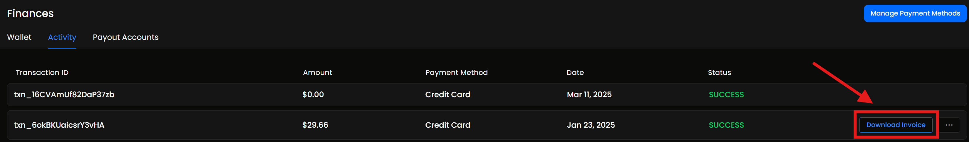 To download your invoice from the transaction list, hover over the transaction row and click "Download invoice".