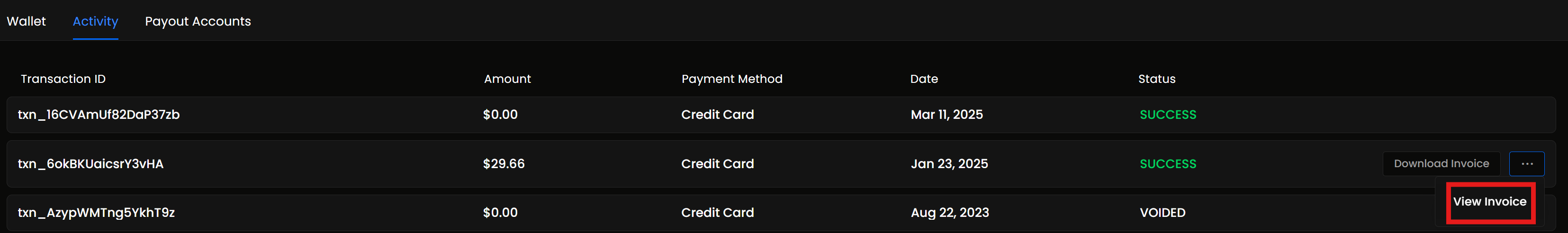 IMPORTANT NOTE: Only successful payments generate invoices. VOIDED or FAILURE transactions won’t show an invoice.
