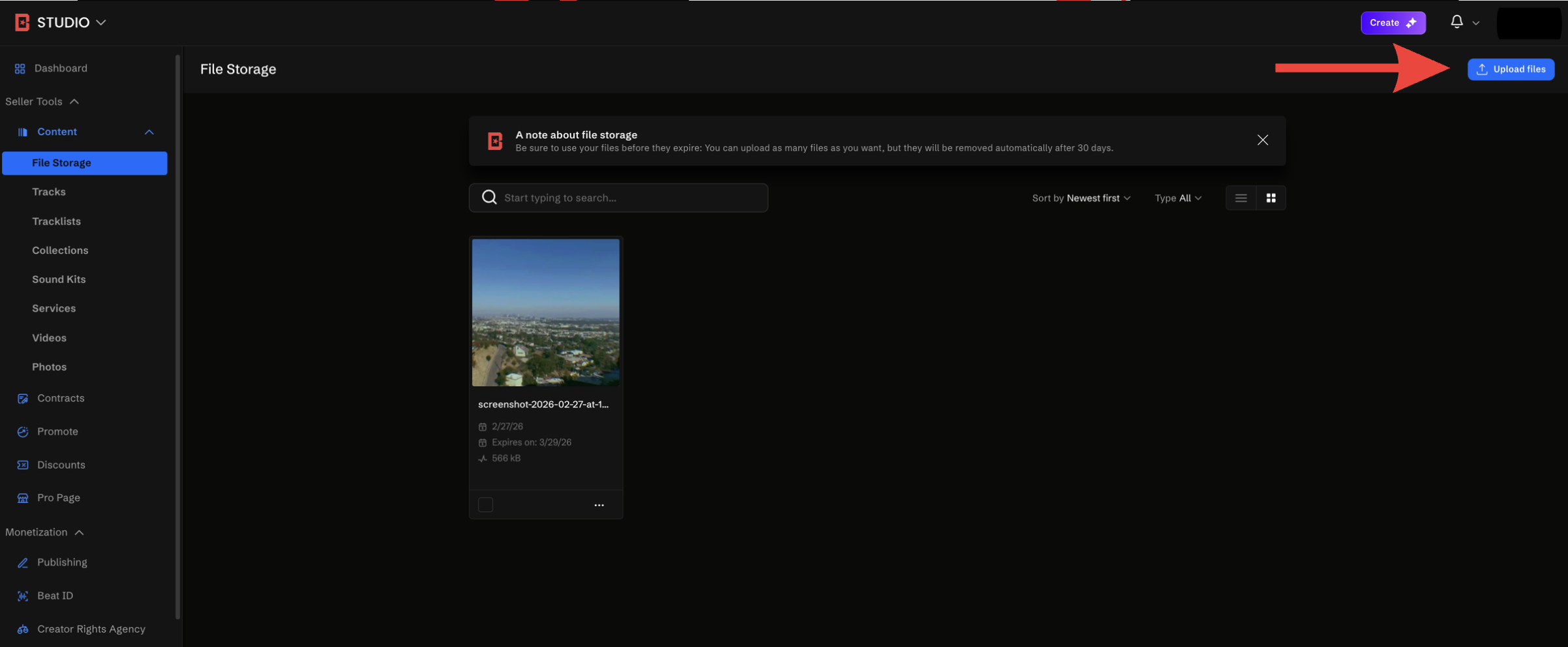 - Log in to your BeatStars account and visit the Content > File Storage section of BeatStars Studio.