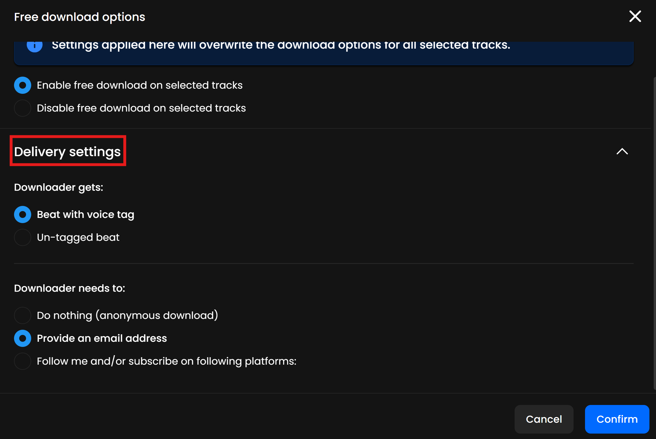 - Select the option next to "Enable free download on selected tracks", then "Confirm".