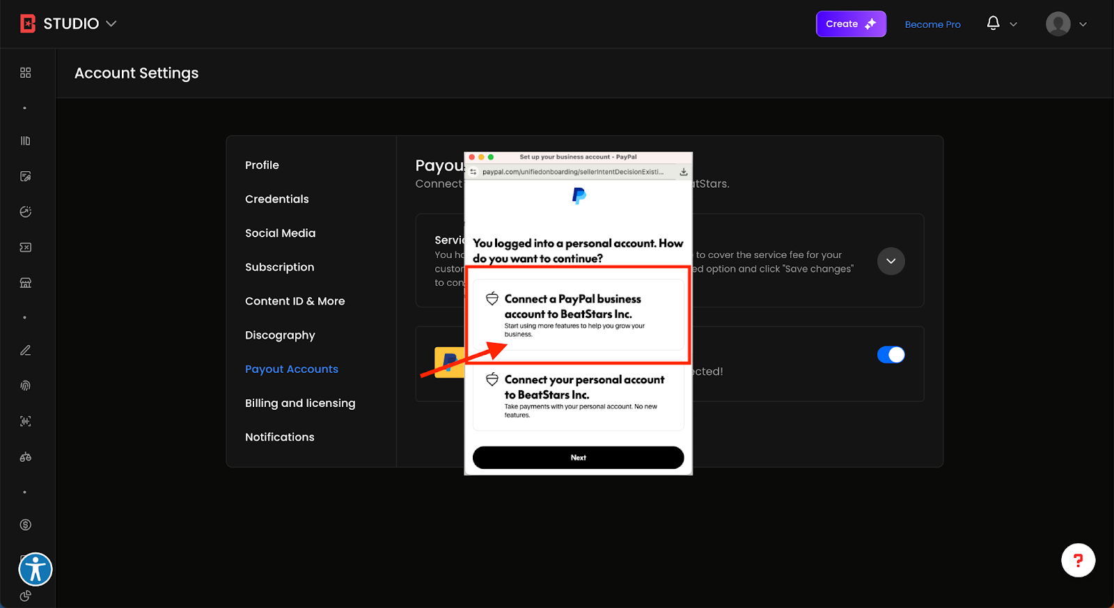 Navega a Configuración de la cuenta → "Cuentas de pago" en tu BeatStars Studio.