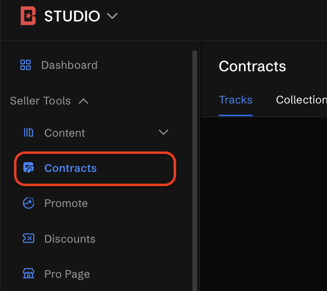 - Après avoir accédé à votre Studio, localisez et cliquez sur la section Contrats. Cette section contient tous les contrats que vous avez créés ou disponibles, vous permettant de gérer vos options de licence.