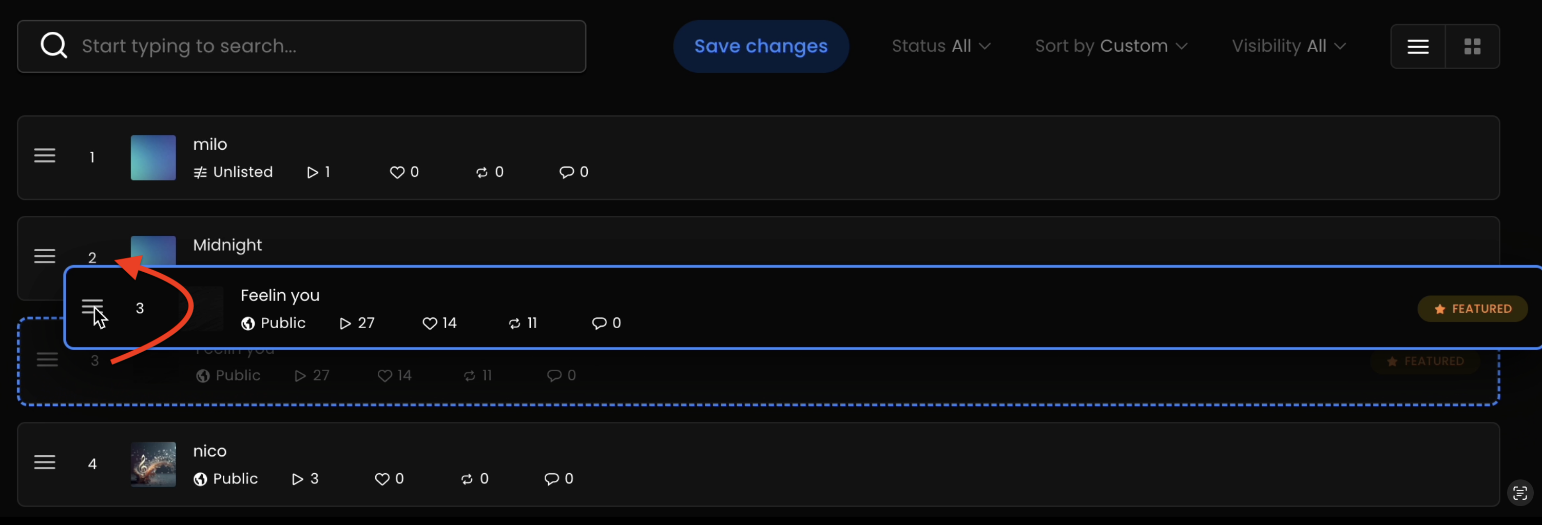 In questo articolo, imparerai come riordinare le tue tracce pubblicate in BeatStars Studio. Questo ti permette di personalizzare l'ordine di visualizzazione delle tue tracce per i potenziali acquirenti, migliorando la visibilità e l'organizzazione.
