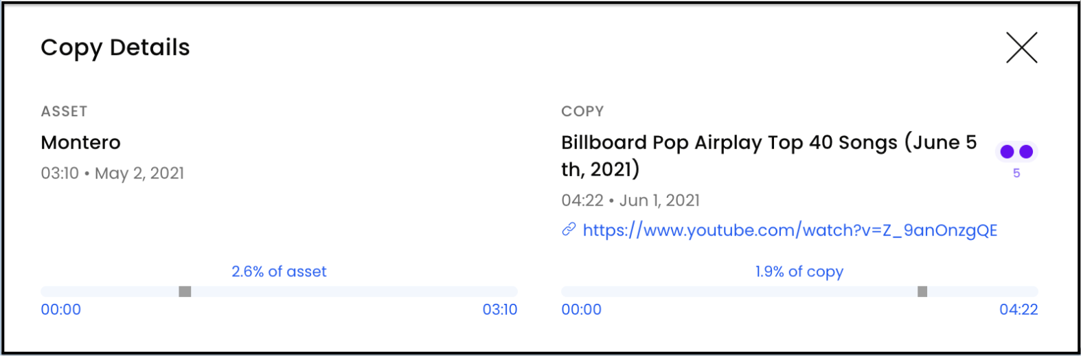 - Una volta cliccato su una copia, potrai vedere quale percentuale del tuo asset è stata utilizzata, a quale timestamp è stata usata e ricevere un link a quella copia.