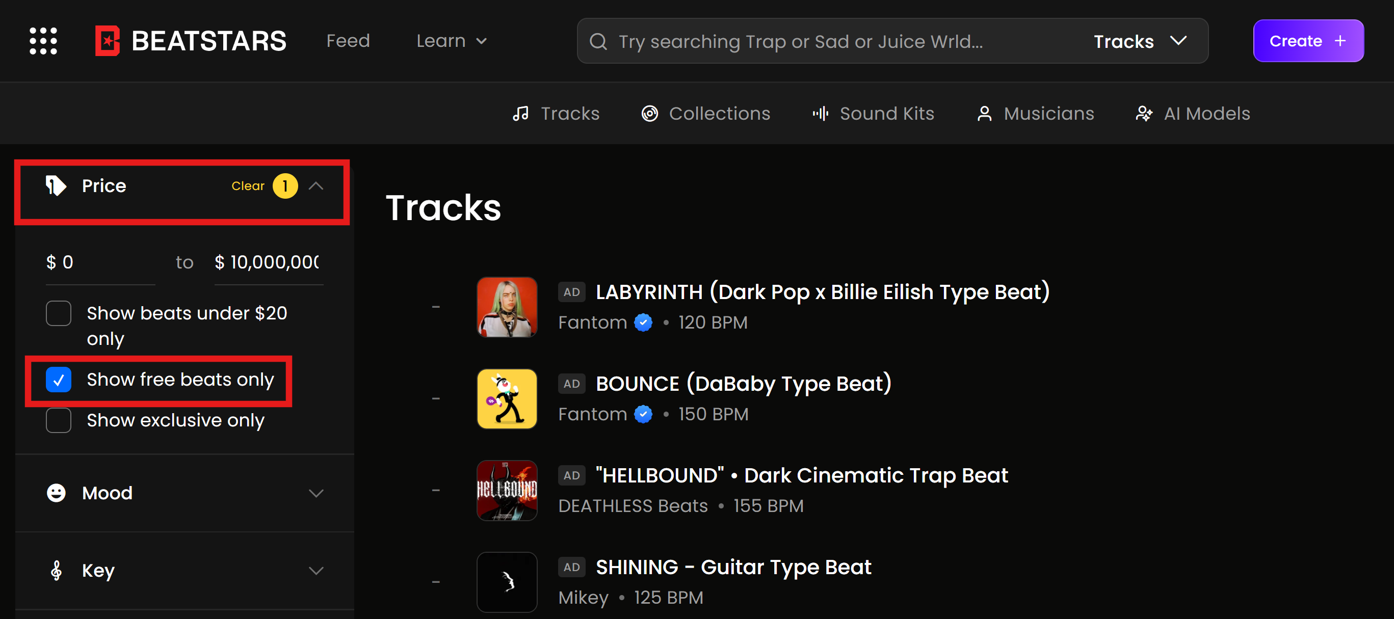 - Para buscar beats com download gratuito, em "Preço" selecione "Mostrar somente beats grátis":