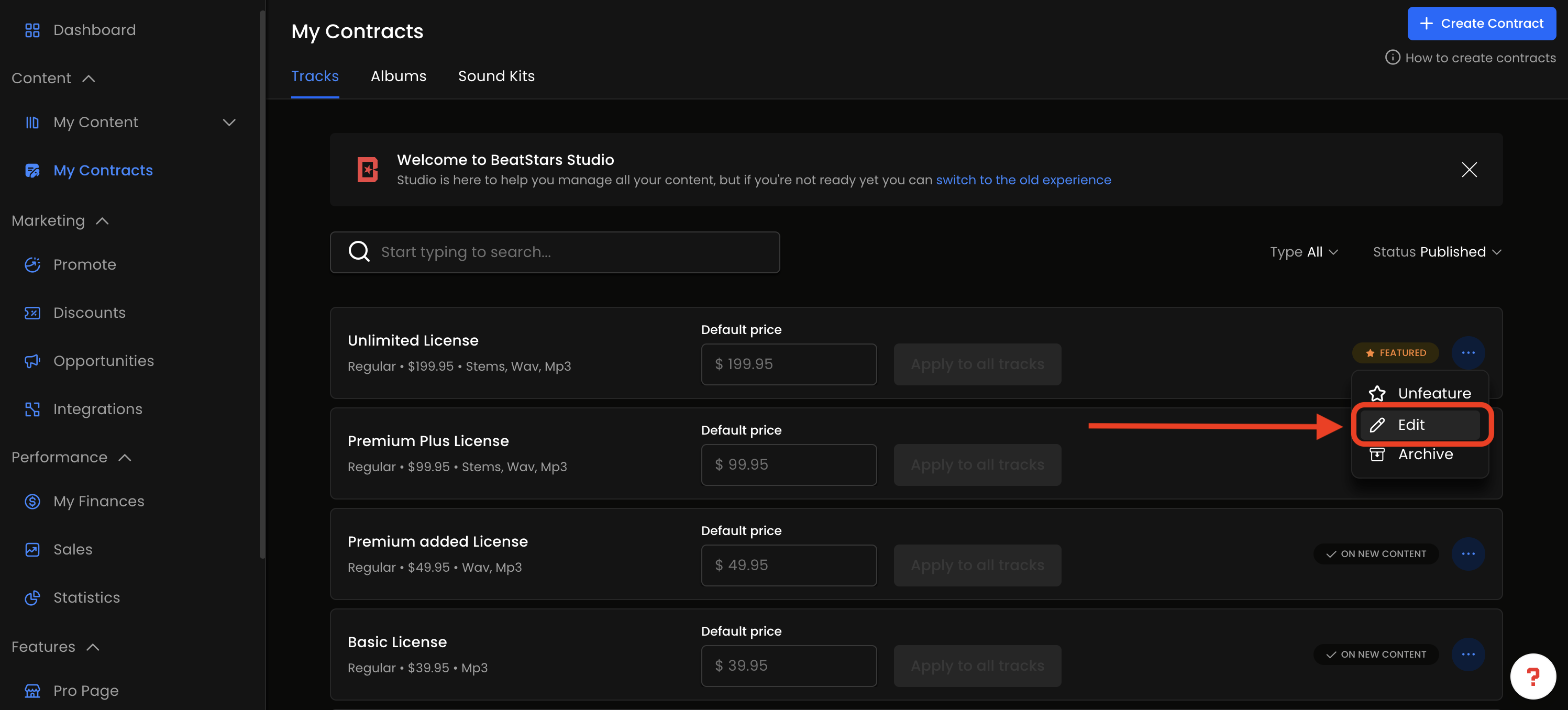 Visite a seção "Contratos" no BeatStars Studio.