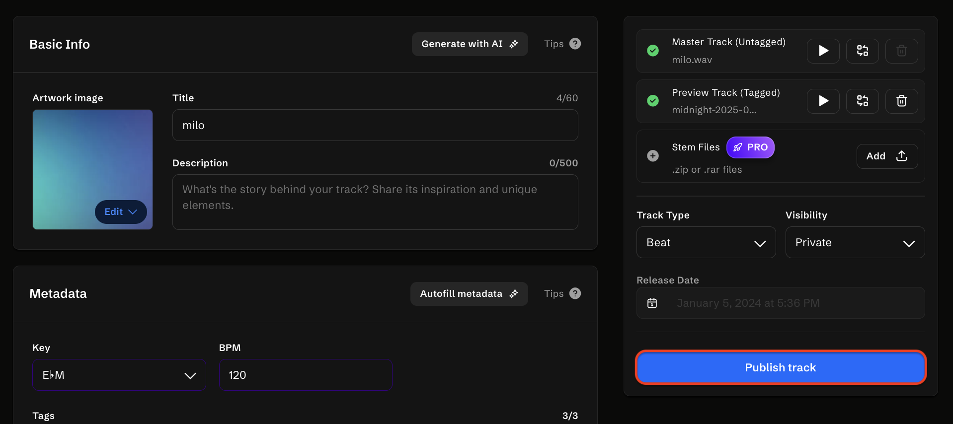 NOTA IMPORTANTE: Por favor, reserve um tempo para revisar cuidadosamente todas as suas configurações antes de publicar sua faixa. Certifique-se de que todos os detalhes, incluindo metadados e quaisquer ativos necessários, estejam corretamente fornecidos e configurados de acordo com suas preferências. Lembre-se de que o sistema não permitirá que você publique a faixa a menos que todos os campos obrigatórios de metadados e ativos estejam completos e enviados.