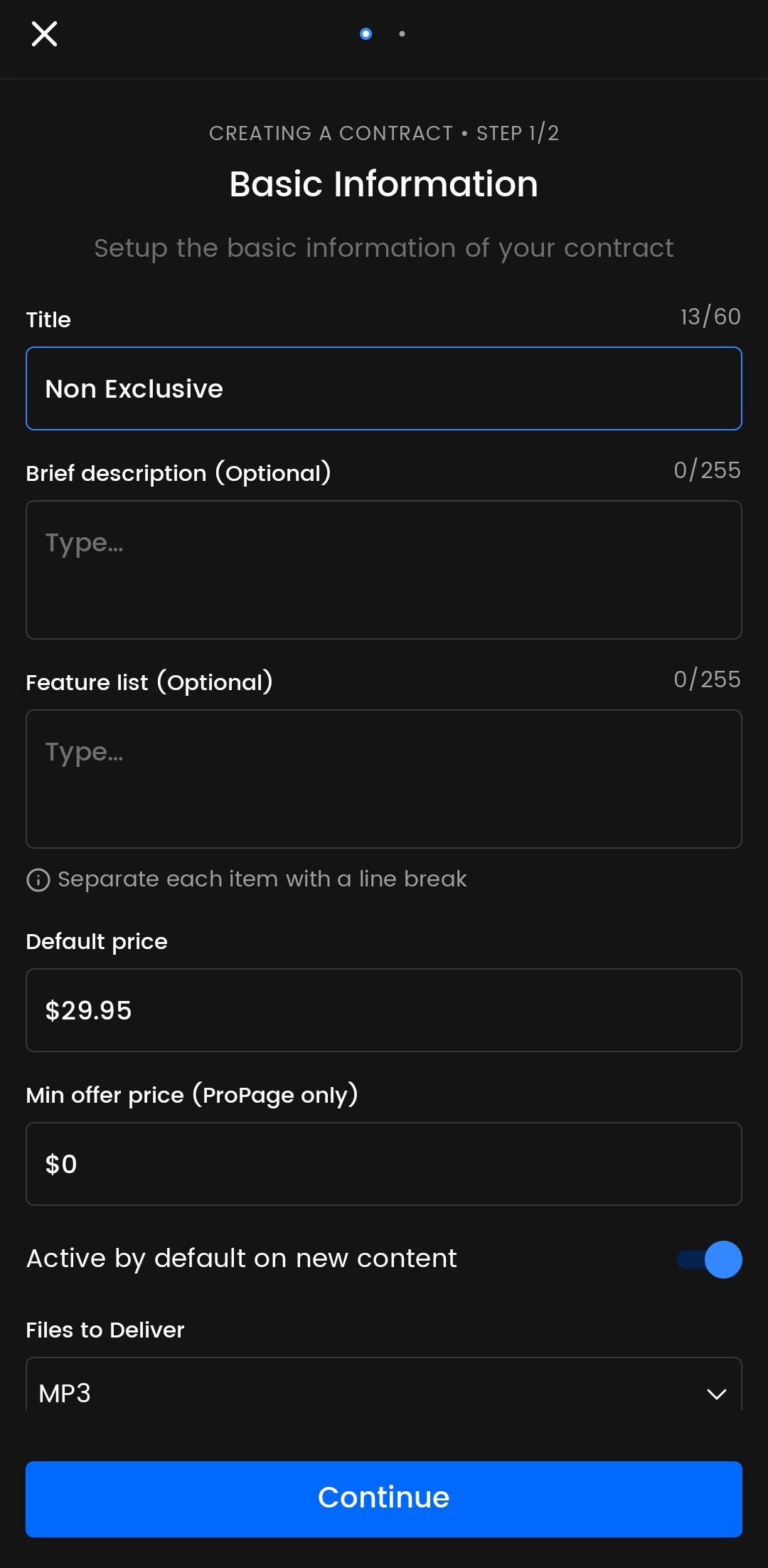 - Insira um título, descrição, lista de recursos, preço padrão e preço mínimo de oferta para seu contrato, e selecione se deseja que o contrato esteja ativo por padrão em novos conteúdos, e quais arquivos entregar.