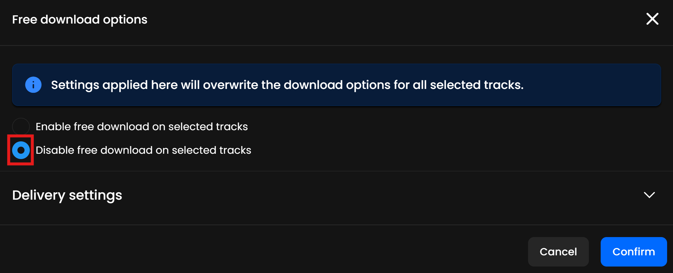 - Выберите опцию рядом с "Отключить бесплатную загрузку на выбранных треках", затем нажмите "Подтвердить".