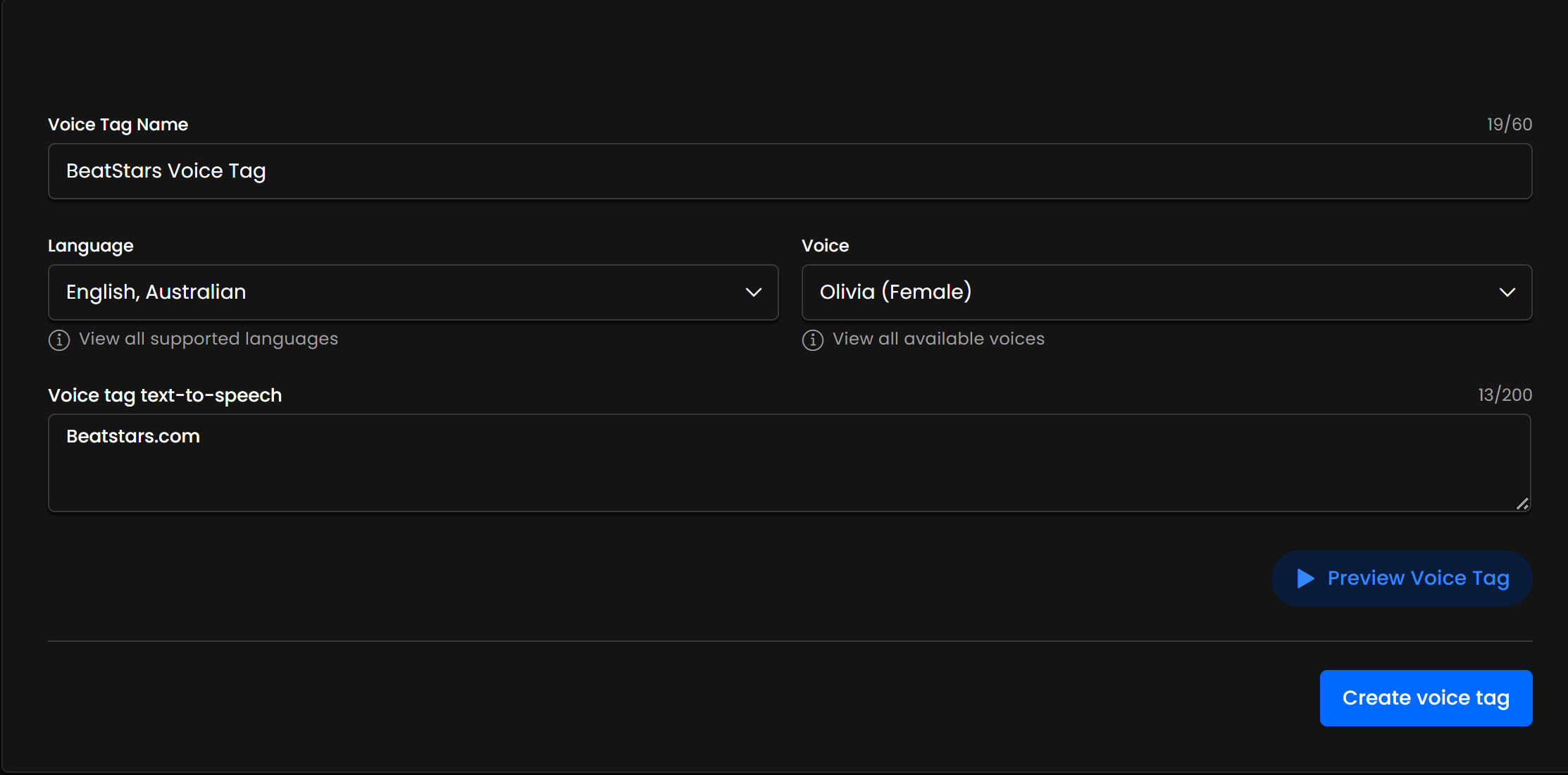 Если вы выберете создание персонализированной голосовой метки, введите название голосовой метки, выберите язык и голос, а также введите текст для синтеза речи голосовой метки.