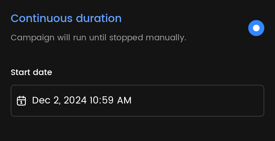 - 如果您希望手动开始和暂停广告,也可以将广告设置为持续运行。